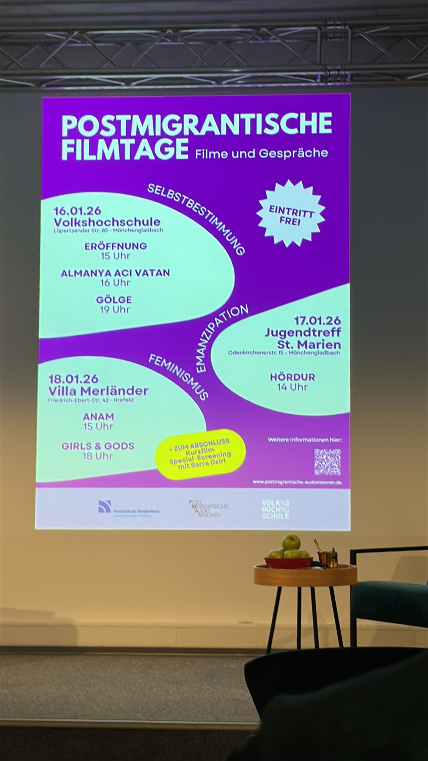 Was bedeutet es, in einer Gesellschaft zu leben, die von vielfältigen Herkünften geprägt ist? Die „Postmigrantischen Filmtage“ holen diese Fragen aus dem politischen Diskurs direkt zu uns in die Quartiere. An drei besonderen Spielstätten in Mönchengladbach und Krefeld zeigen wir sechs ausgewählte Spiel- und Dokumentarfilme und einen Kurzfilm, die den Fokus auf postmigrantische Lebensrealitäten richten.